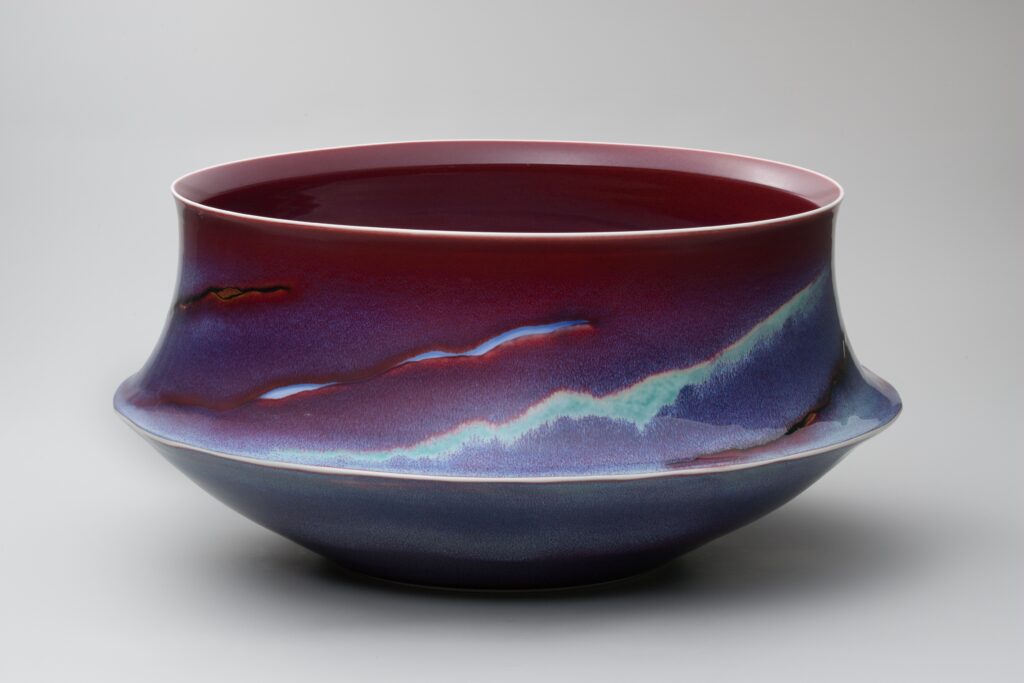 最高の栄誉を冠した【遥かな嶺】と銘打った花器には、朝焼けの紅の空に広がる美しい雲から覗く孤高の山嶺の姿が、辰砂釉で表現されています。